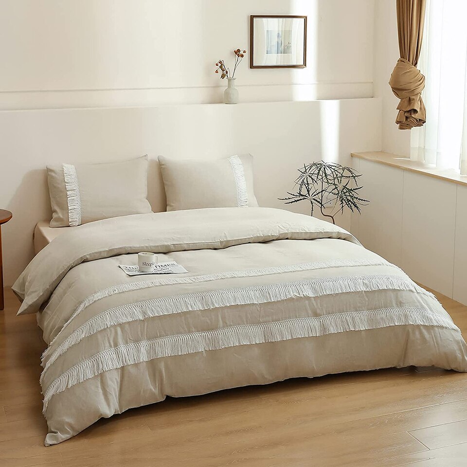 Simple&Opulence Linen Cotton 3Pcs Boho Bedding Set with Tassel Washed Comforter