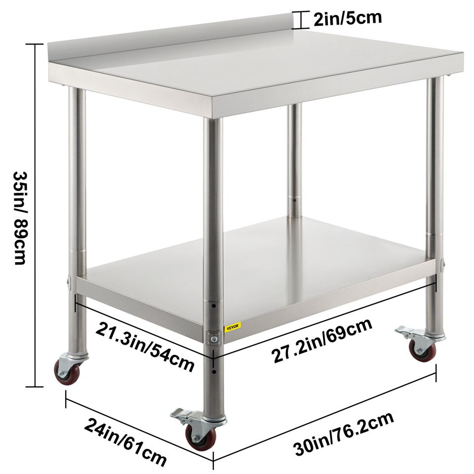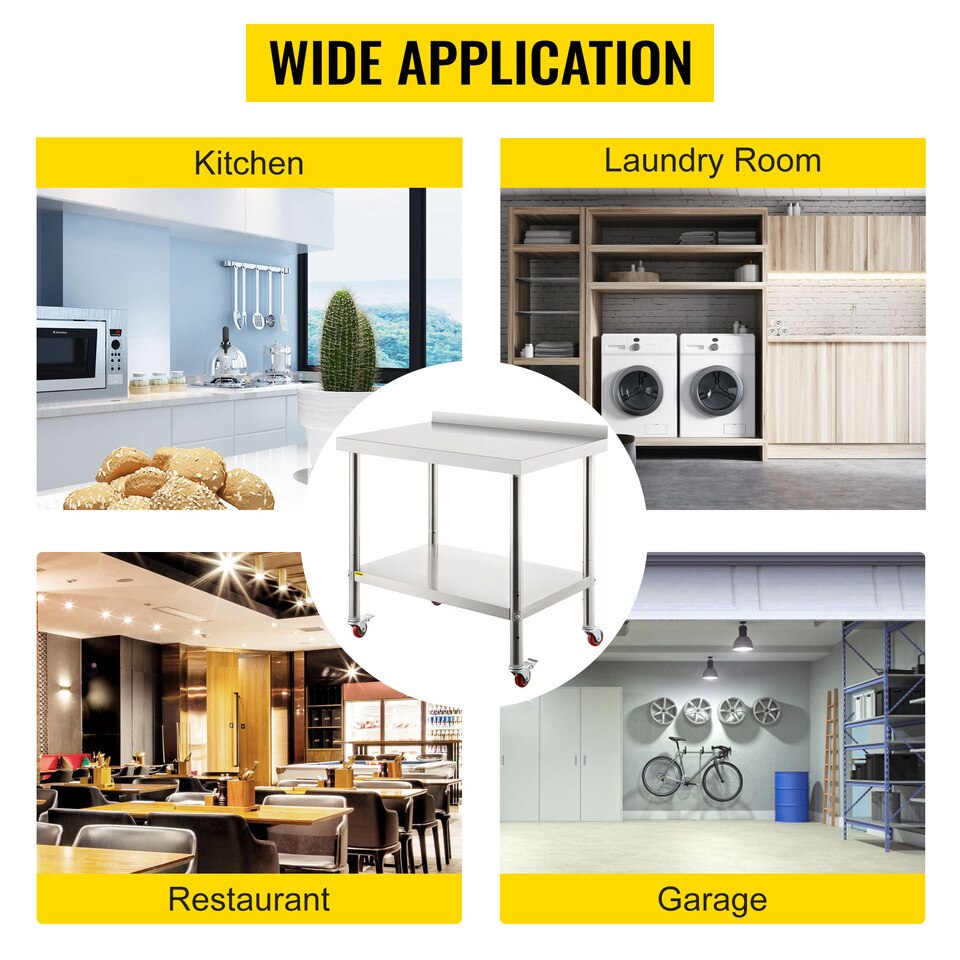 Rock Solid Material: Our kitchen work table is made of 201 stainless steel material, ensuring that it’s rust-proof, corrosion-proof, and easy to clean. With the wire-drawing surface, this table offers a beautiful appearance, is not easy to scratch, and hardly leaves water stains. The 2-inch high backsplash is equipped to keep the items from falling. The smooth edges can keep your hand from getting hurt. Besides, the 4 flexible casters (2 with brakes) are well-designed for moving conveniently.